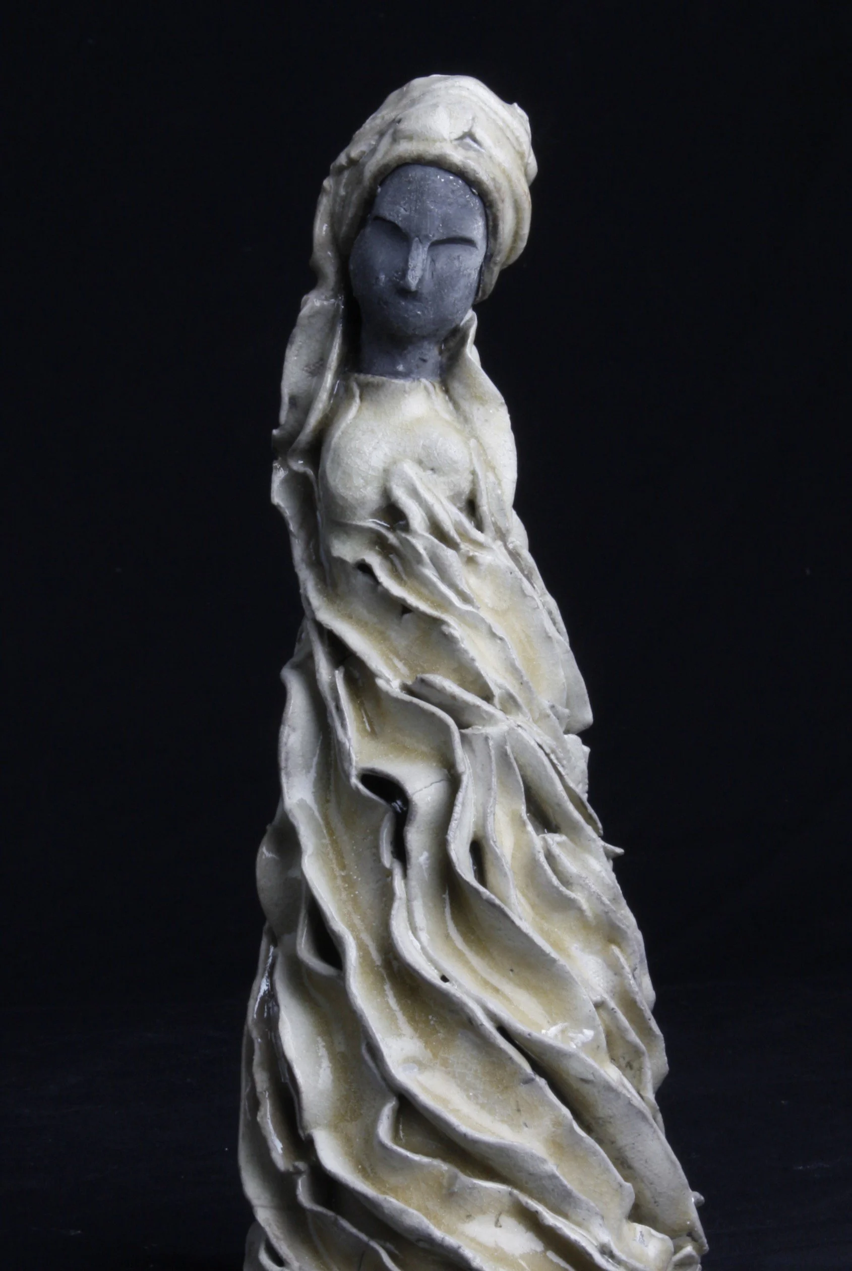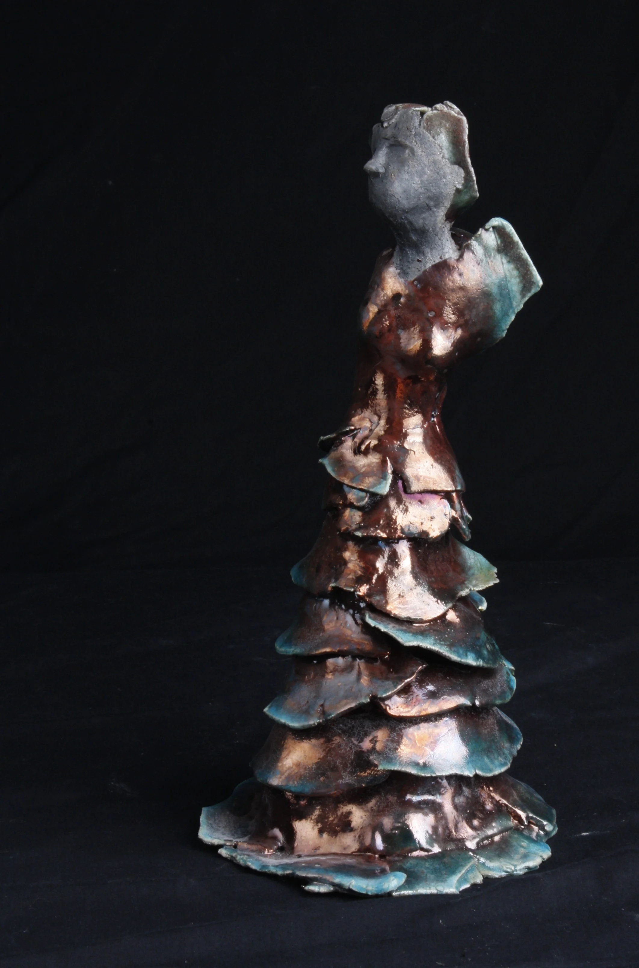 What is Raku in ceramic art? It is a glaze process discovered by the Raku family in Japan. As they were glazing their teacups, there was an accident and all the glazes were transformed from the expected to a surprising array of colors and tones. The Raku family chose to make use of this happy accident and continued to explore and push the technique creating metallic and crackle finishes that are unique to each finished piece. I use the Raku process to glaze these unique beauties. The glaze enhances the sense of strong individuality which I strive to capture for each goddess figure.
